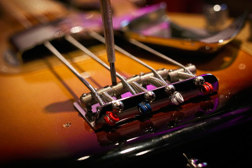 To get there, you want to make even adjustments, preferably one quarter turn at a time, to the screws at the bridge which hold down the bridge.
